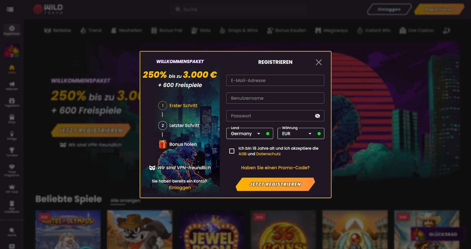 Kostenlos spielenWild Tokyo250% Bonus bis 3000 € + 600 FS
